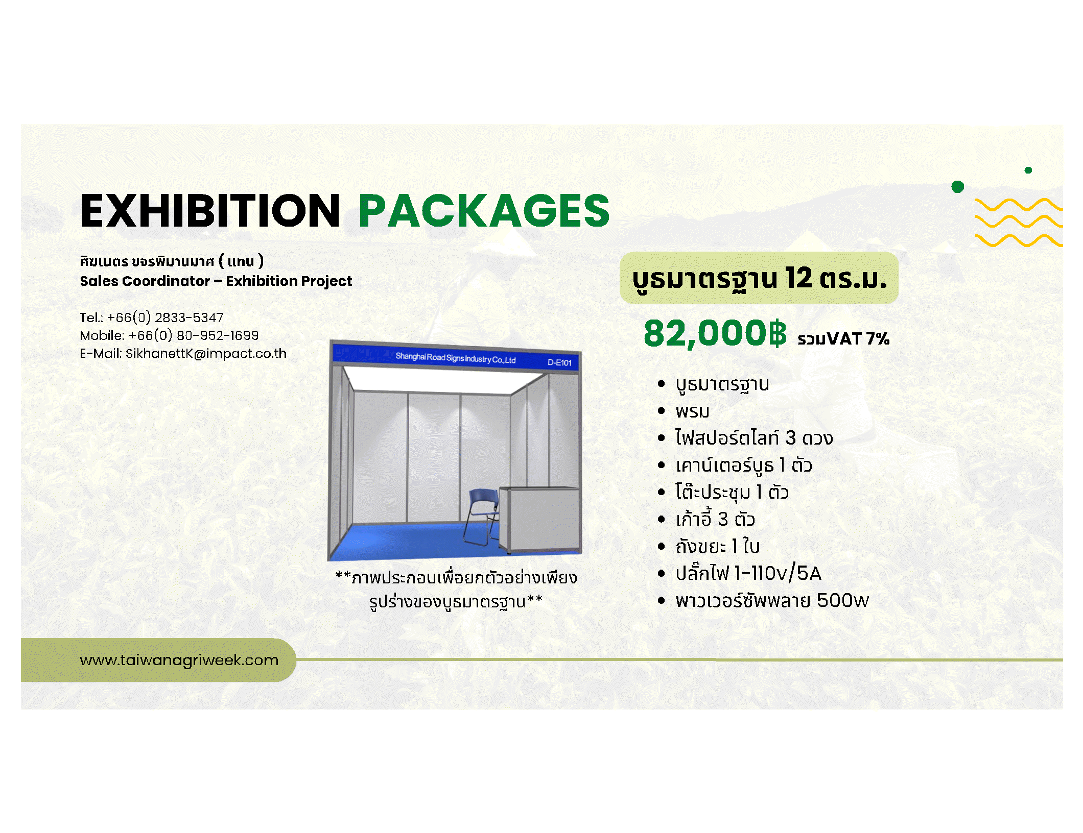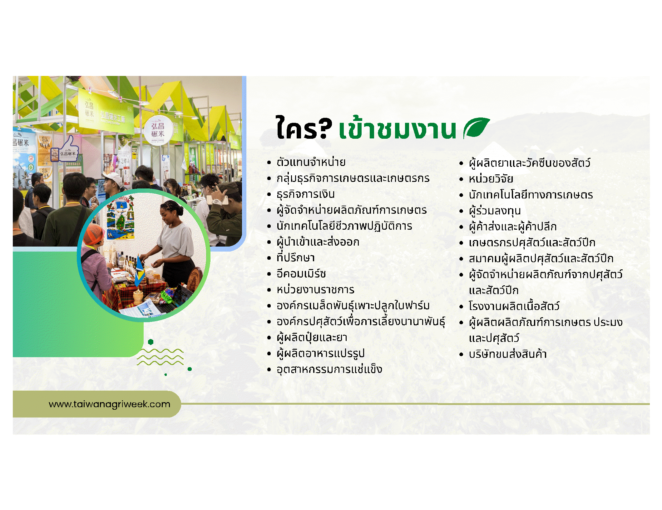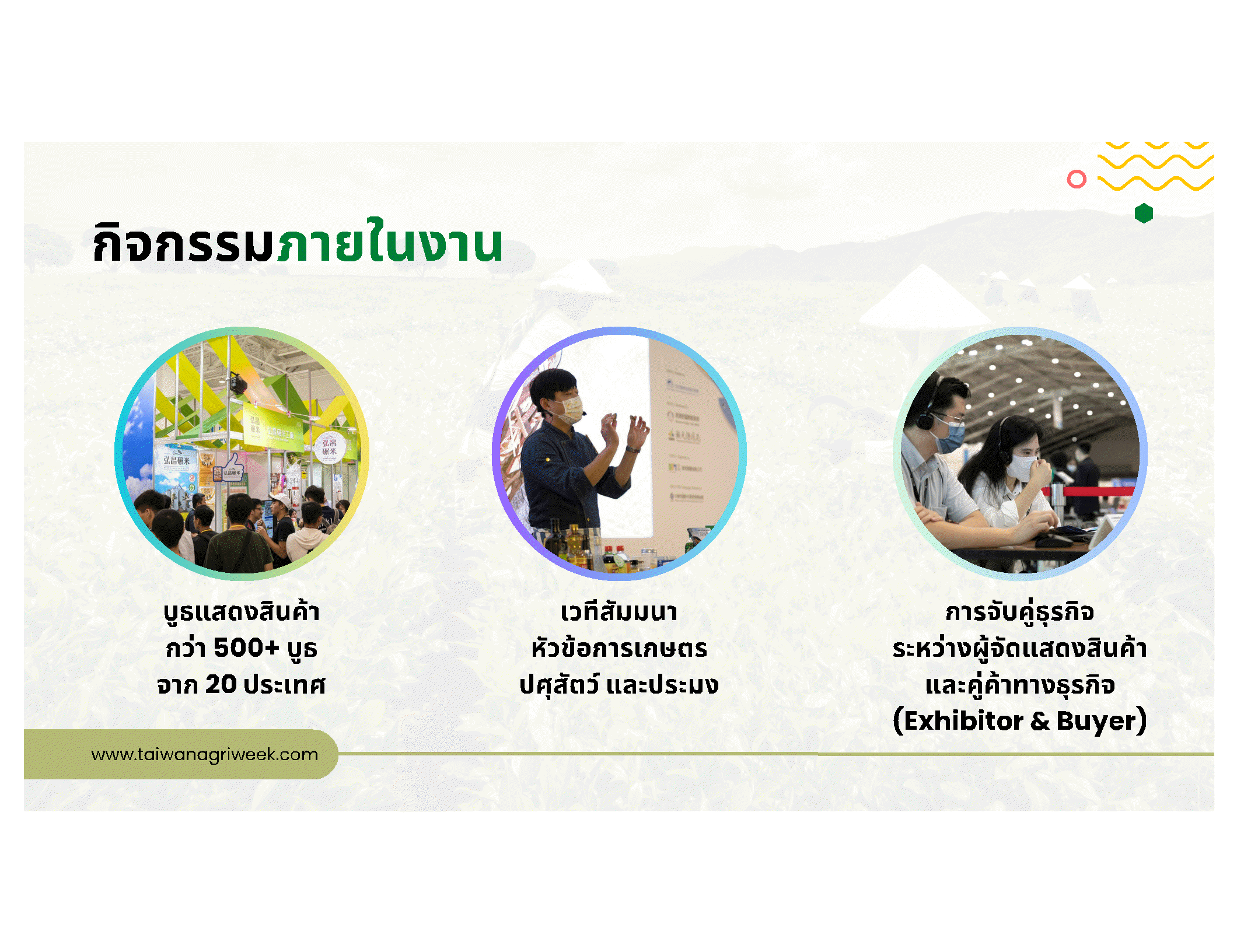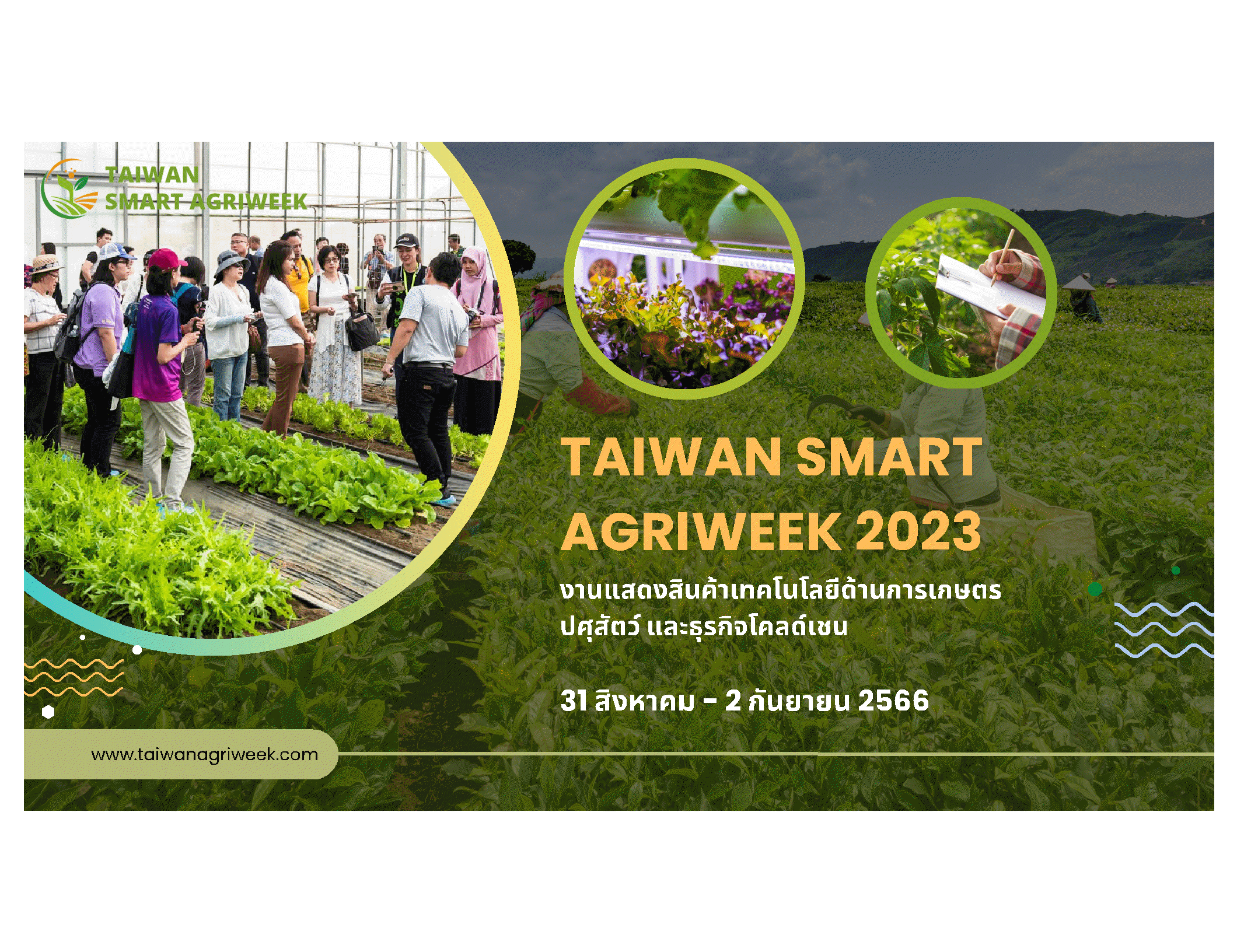 13 มิถุนายน 2023 ข่าวประชาสัมพันธ์ Taiwan Smart Agriweek 2023ขอเชิญผู้สนใจ ผู้ประกอบการ เข้าร่วมงานแสดงสินค้าเทคโนโลยีด้านการเกษตร ดูรายละเอียดเพิ่มเติมได้ ที่นี่