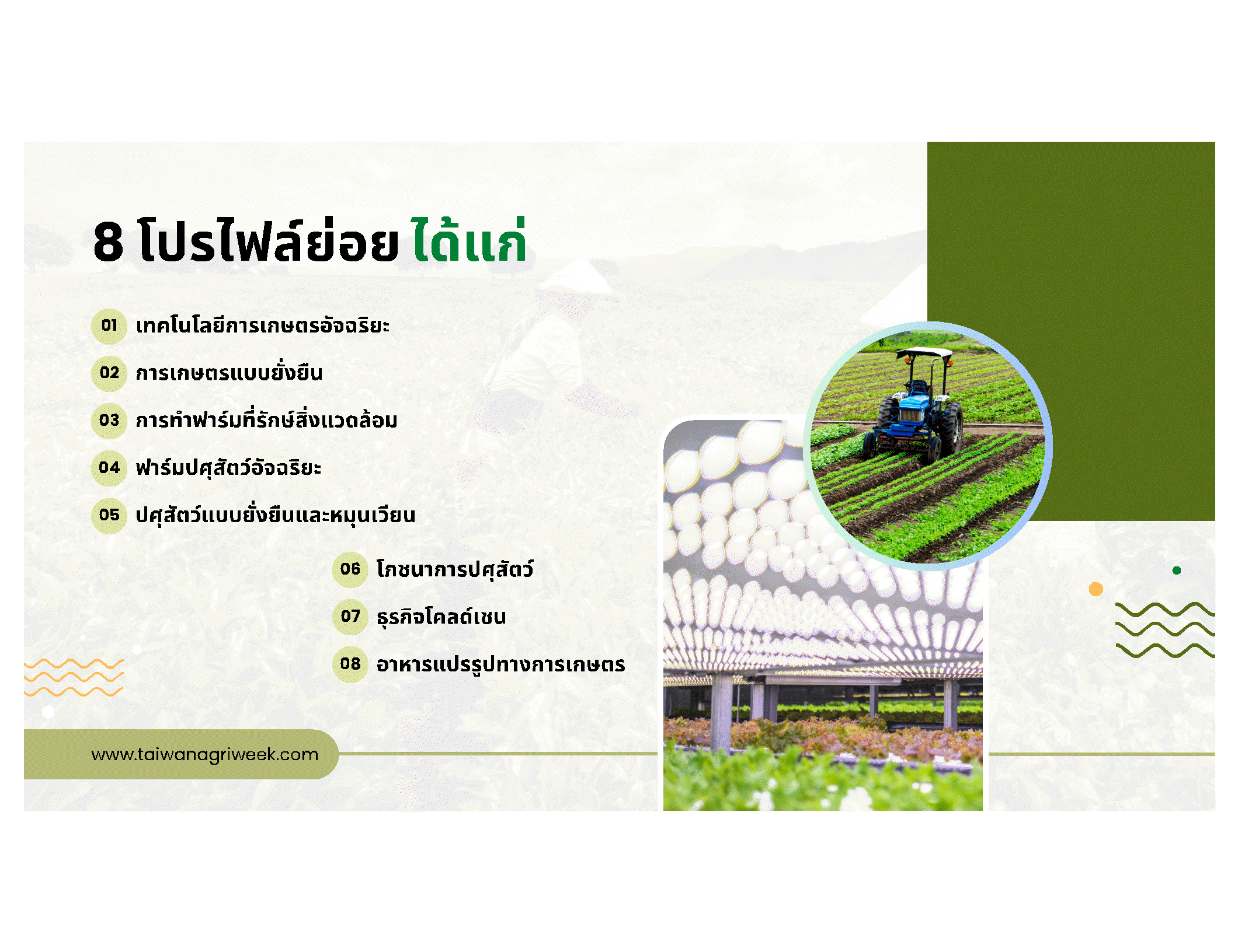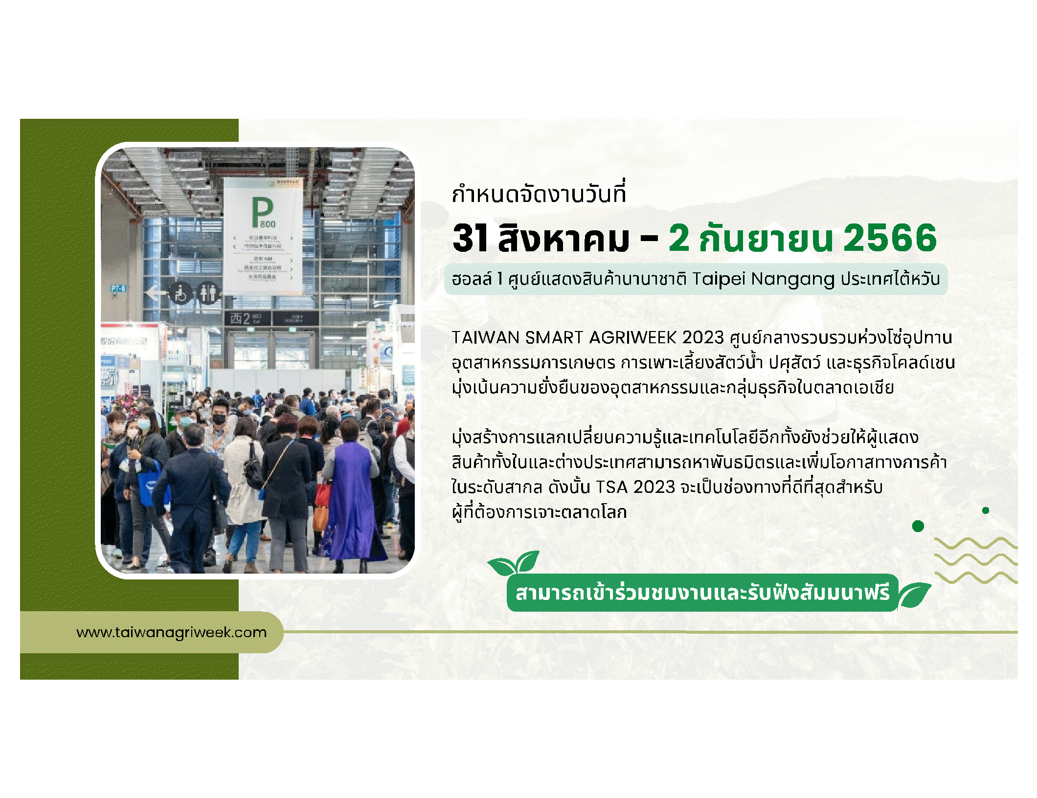 13 มิถุนายน 2023 ข่าวประชาสัมพันธ์ Taiwan Smart Agriweek 2023ขอเชิญผู้สนใจ ผู้ประกอบการ เข้าร่วมงานแสดงสินค้าเทคโนโลยีด้านการเกษตร ดูรายละเอียดเพิ่มเติมได้ ที่นี่