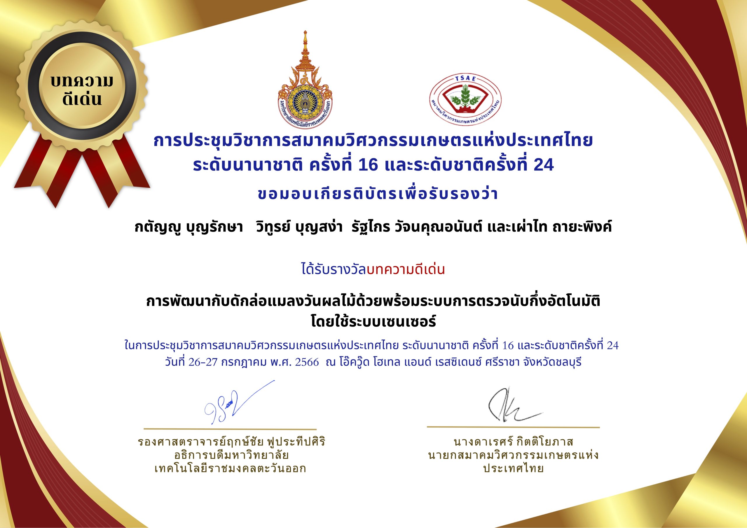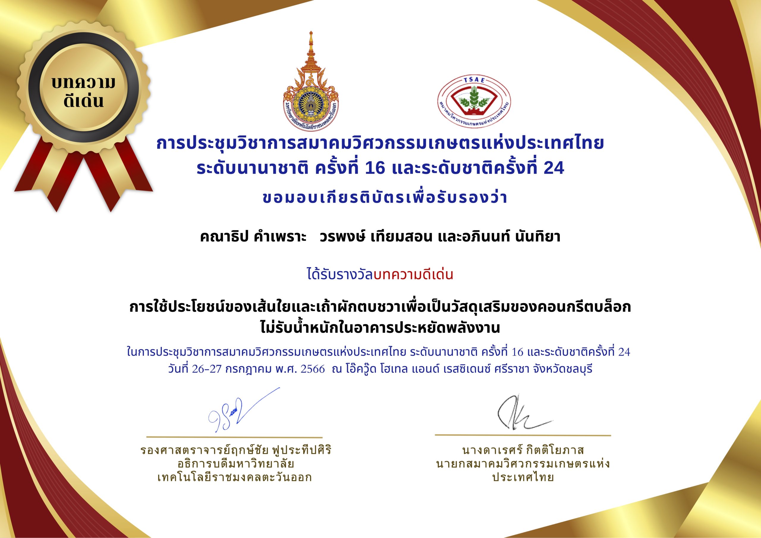 และบทความวิชาการที่ได้รับรางวันดีเด่น ได้แก่